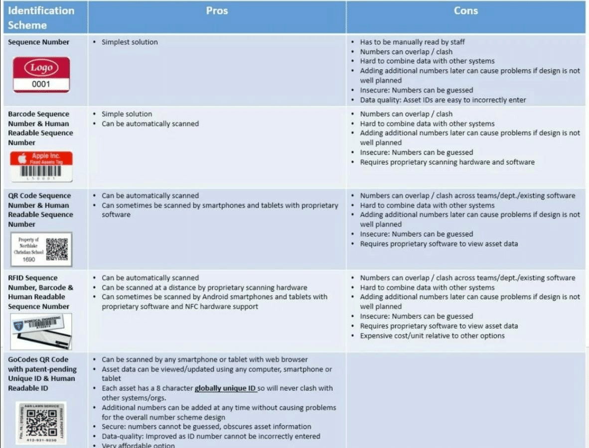 It is also a good idea to include a unique code for each item. Here is an example of a GoCodes Asset Tracking ID generated for a fixed asset: