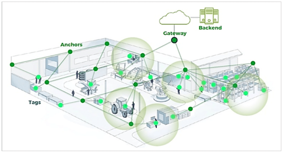 In the image below, light green “tags” are actually beacons, and dark green “anchors” are stationary BLE receivers.