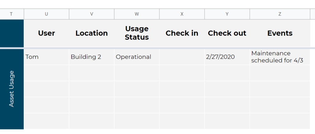 A Date for Check-In and Check-Out: When was the asset taken from its usual location, and when is it due for return? When was it last used? This is important for location tracking if an item is not fixed with a GPS tag.