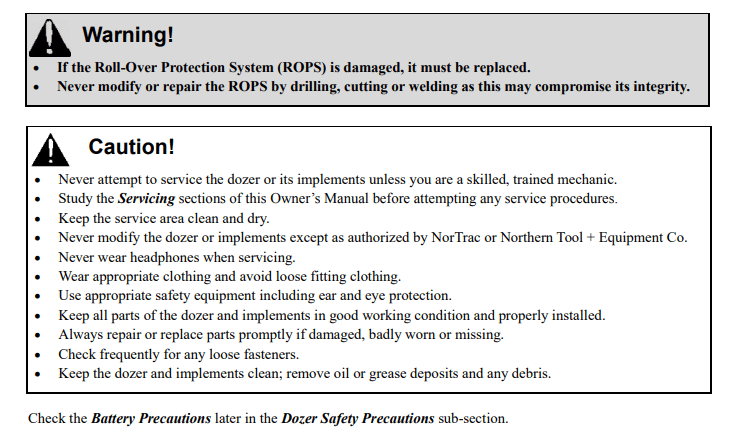In their manual, Northern Tool has different safety sections, from basic service instructions to asset-specific ones, like in the image below.