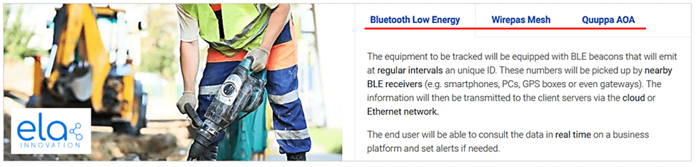 As for real-time tracking of worksite tools and equipment, ELA Innovation offers three Bluetooth-based solutions you can see highlighted below.