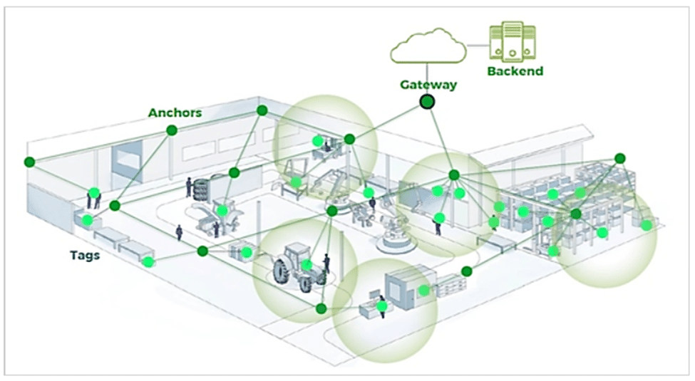 Depending on the network’s density (number of fixed beacons), assets can be accurately localized within 15-30 ft (5-10 meters).