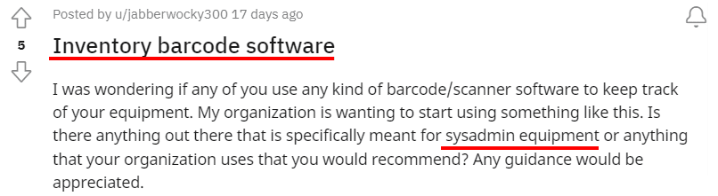 Here’s a recent Reddit conversation where a system administrator is looking for solutions to track the company’s IT equipment.