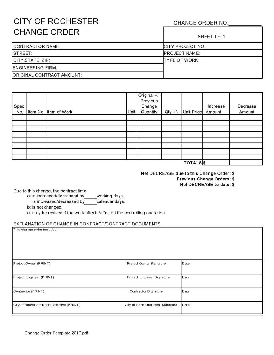 At the top, there are fields that include the project basics (change order number, date, name of the project).