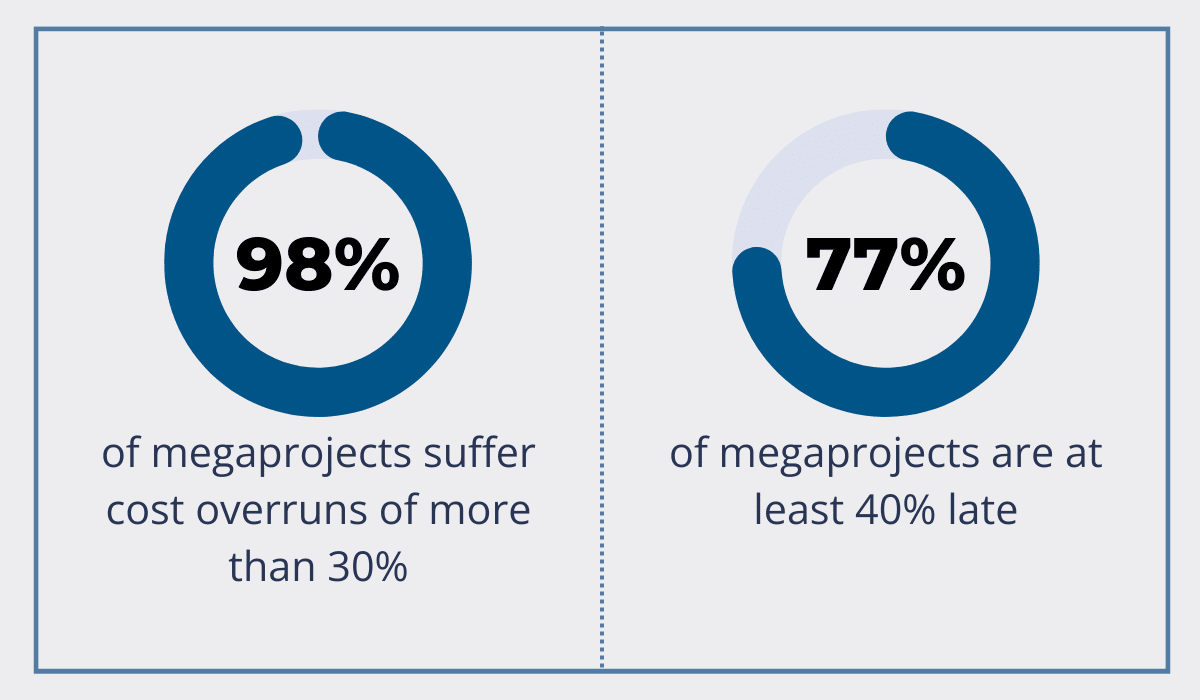 According to McKinsey, a staggering 98% of megaprojects suffer major cost overruns, and 77% are at least 40% late.