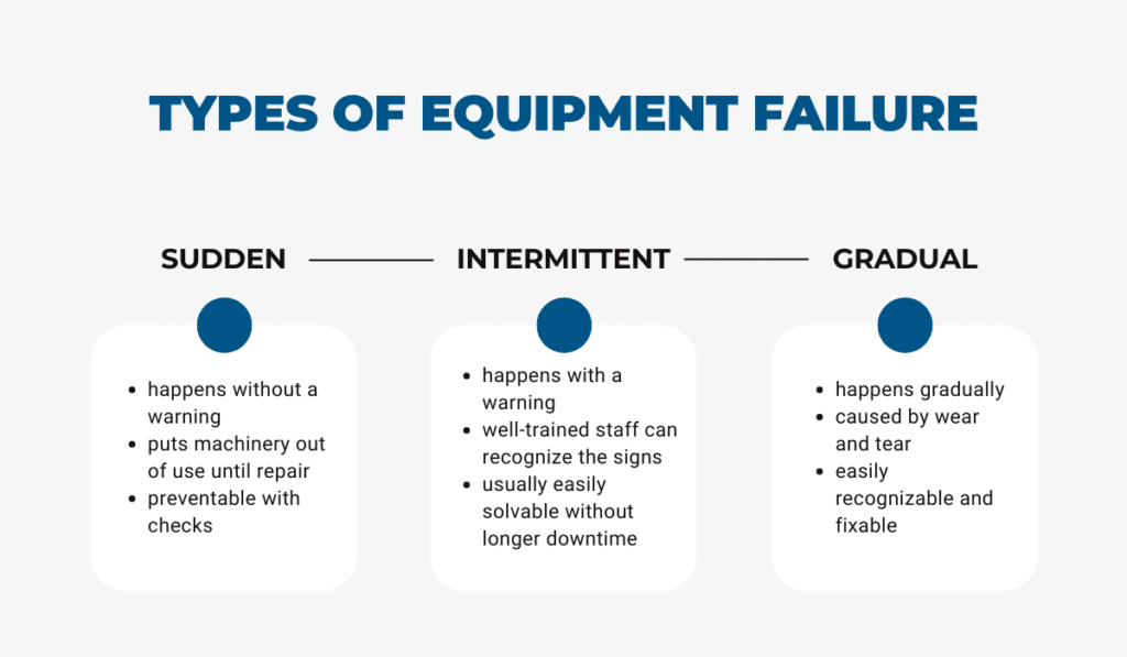 As you can see, the only unpredictable type of failure is the sudden one, as it occurs with no prior warning. Still, frequent maintenance can help you locate any weak or concerning machinery parts and monitor them, and thus avoid unwanted surprises.