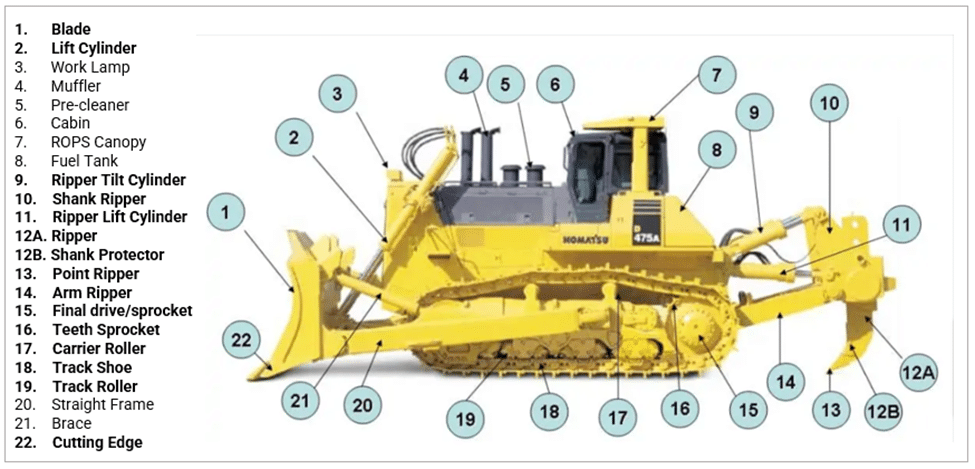 For example, in the below image of dozer components, the high-wear parts are highlighted in bold letters: