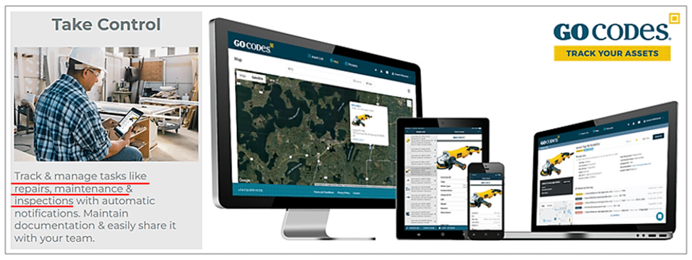 GoCodes Asset Tracking uses patented QR code labels (affixed to each piece of equipment subject to maintenance), cloud software, and an in-app scanner.