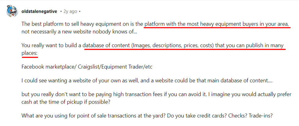One Reddit user looking to sell heavy equipment, attachments, and parts posted that very question but specified that the company wanted to start their own website.