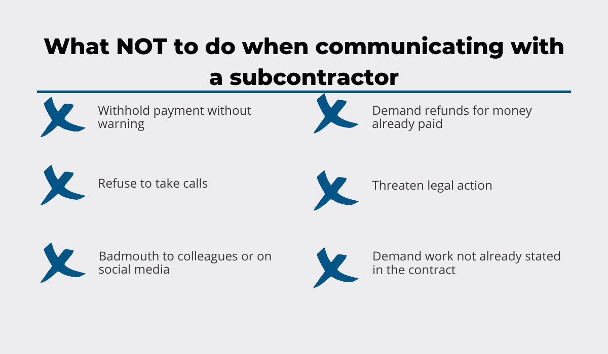 In this way, it’s good to consider what not to do when discussing grievances or substandard work with the subcontractor. Here are a few.