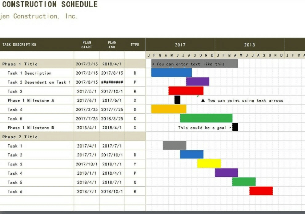 The schedule shown above is effective in a construction proposal because it is color-coded and simply laid out, offering an easy overview of the planned stages of the project.