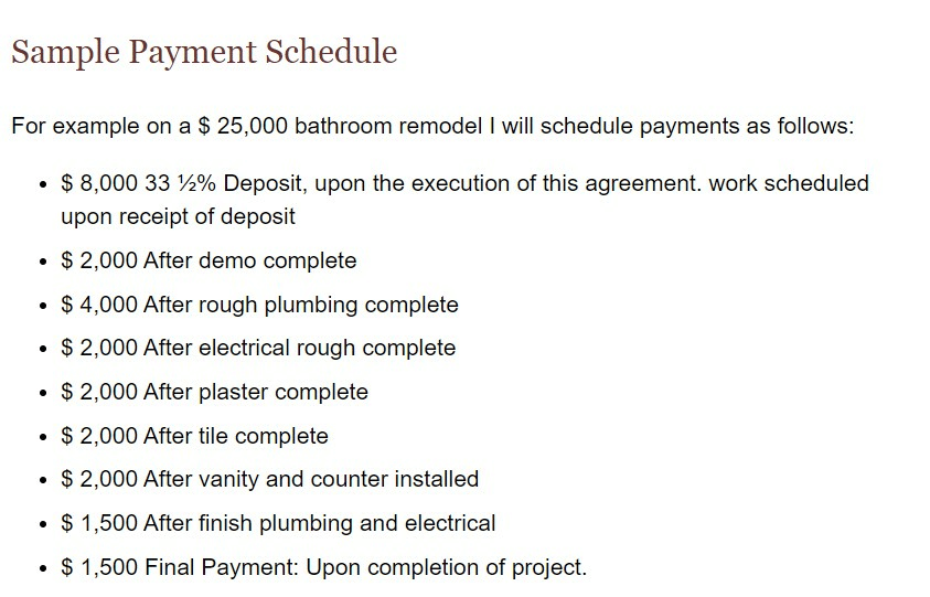Here’s an example of a straightforward payment schedule for a residential bathroom remodel: