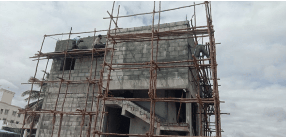 This photo shows external plastering in progress. It is accomplished with scaffolding and covers the appearance of the concrete:
