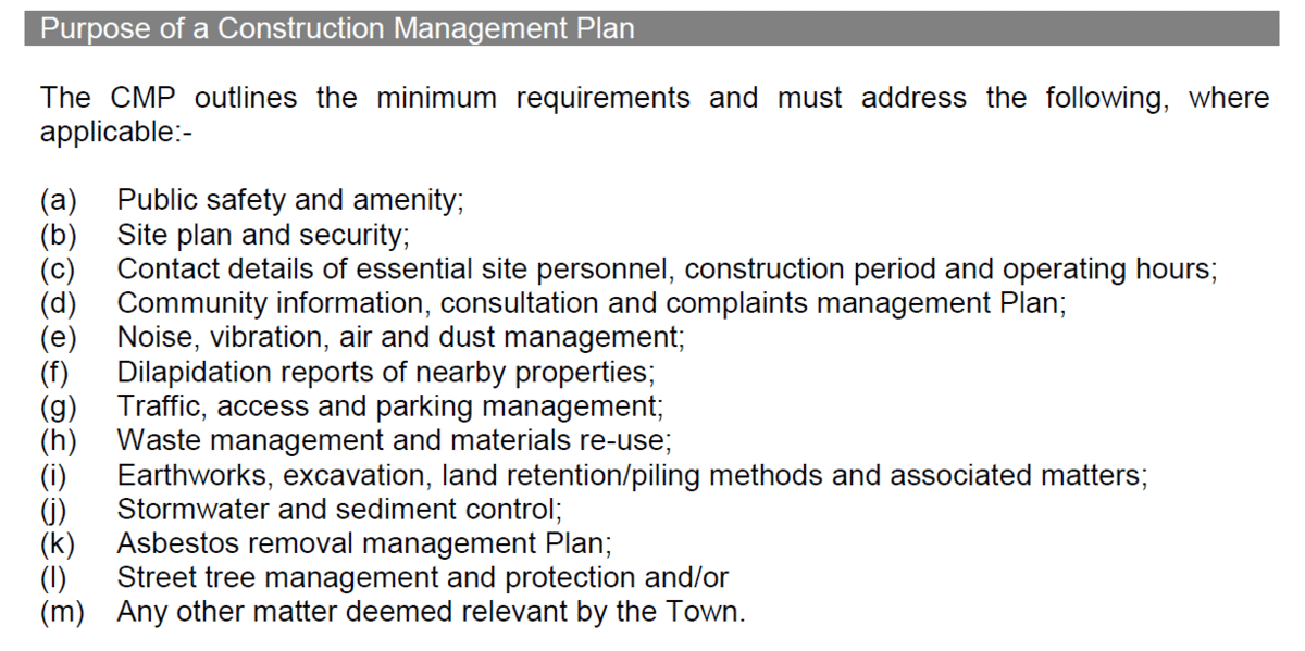 For example, the previously mentioned Town of Cambridge requires all construction companies to include the following in their CMP for approval: