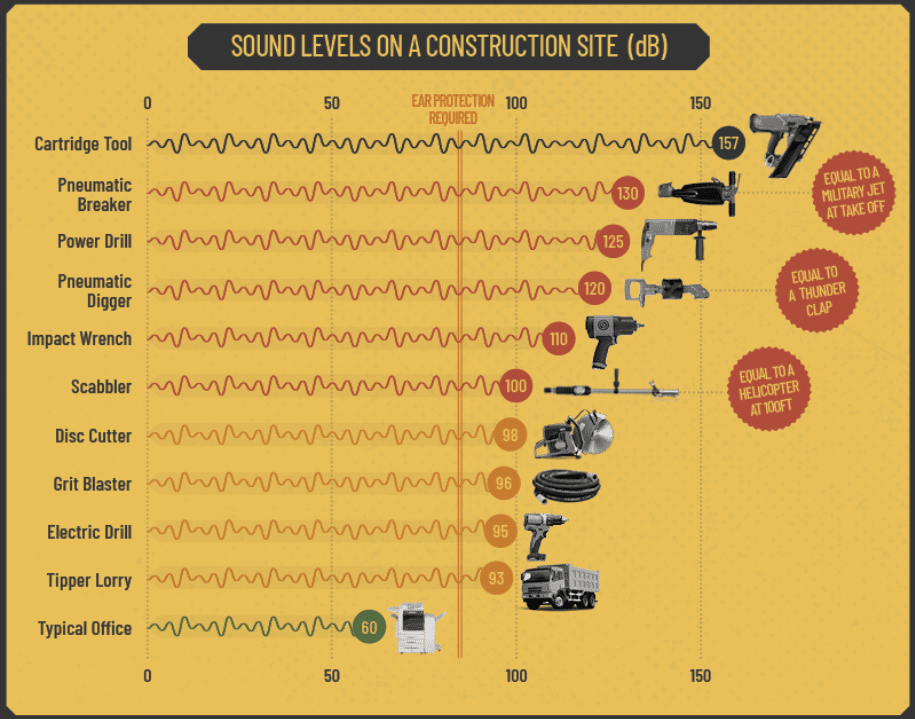 To put these numbers into perspective, an electric drill registers about 95 decibels of noise. Just think about how much noise the rest of your heavy construction equipment is making.