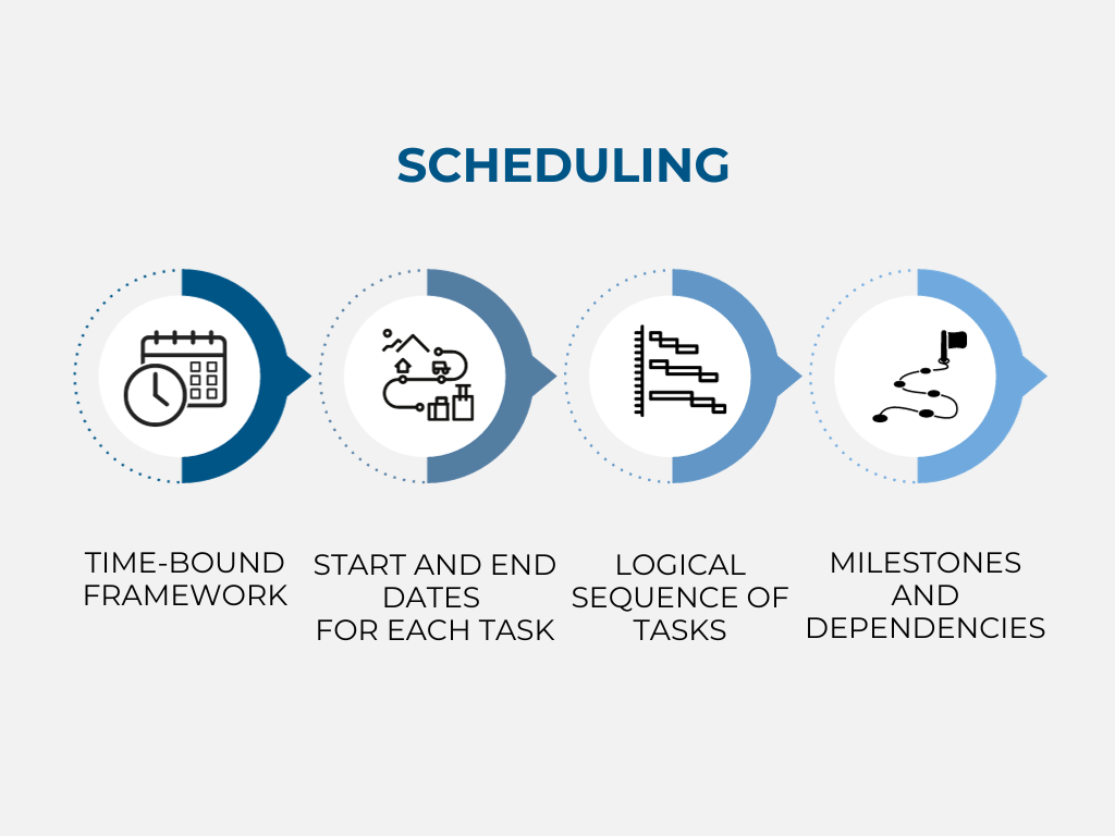 Scheduling ensures that tasks are not only outlined but are also sequenced logically to optimize efficiency.