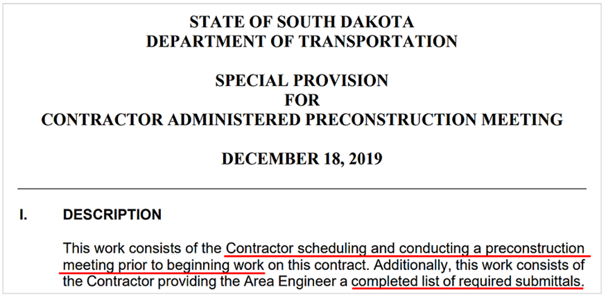 Some project owners, like South Dakota’s Department of Transportation in the below example, have a special contract provision requiring the contractor to schedule and hold such a meeting.
