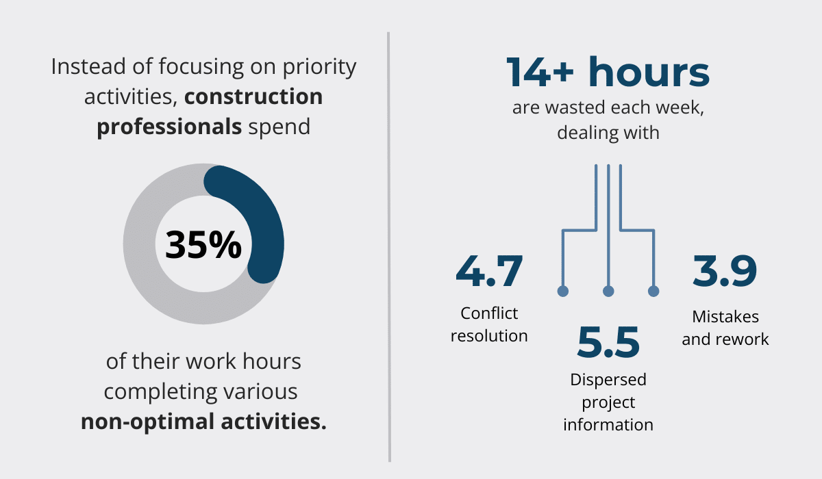 While that is understandable and necessary to an extent, Autodesk and FMI research reveals alarming figures: 35% of work hours are invested in non-productive activities.
