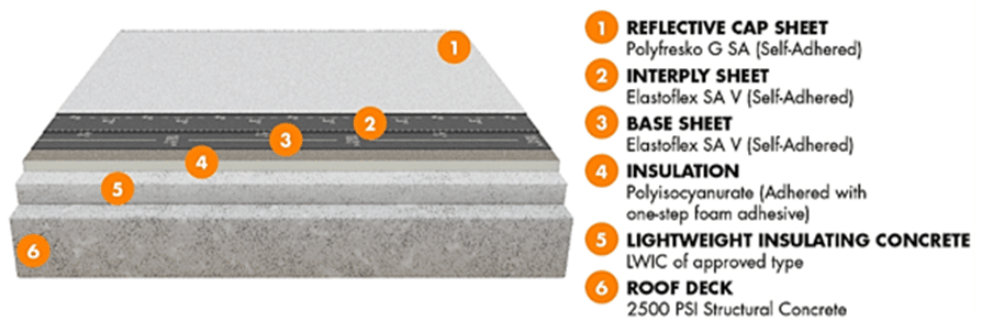 From the bottom up, the roof slab is made from reinforced concrete, followed by lightweight insulating concrete, insulation, and so on.