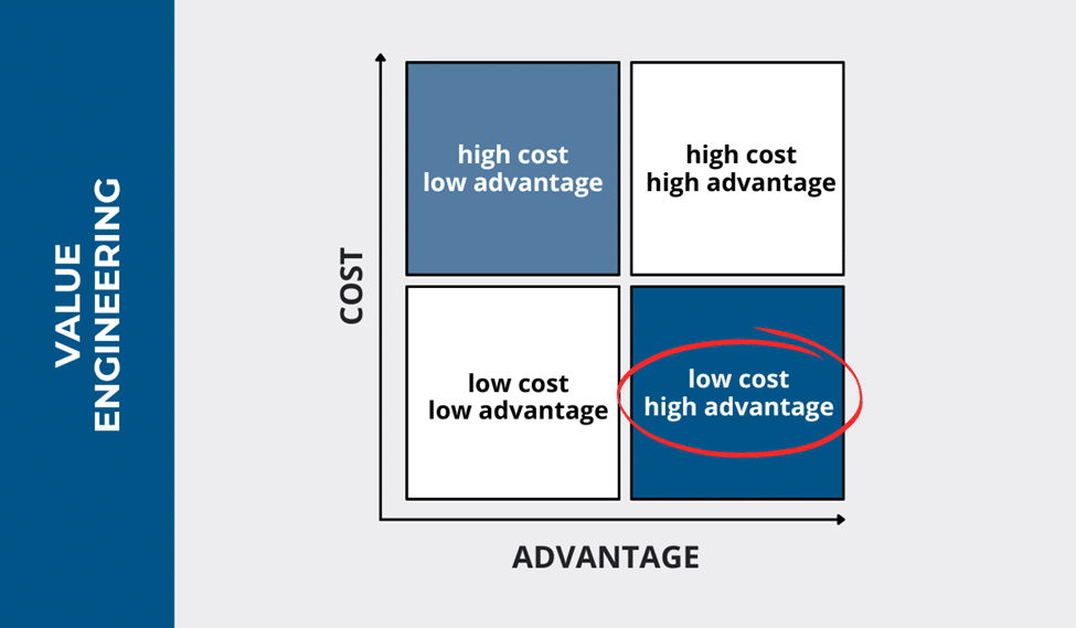 As illustrated, the aim is to identify areas where the project parameters can be modified to achieve the highest advantages (cost-savings) at the lowest cost.