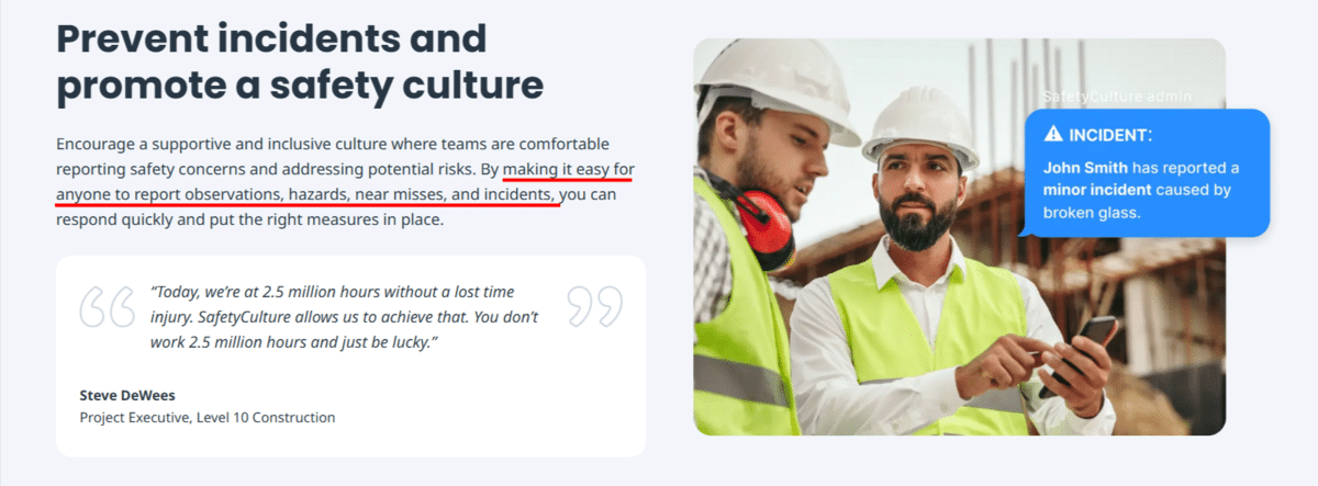 It provides on-site audits and inspections, but also outlines processes that make it easy for workers to report observations, hazards, or incidents.