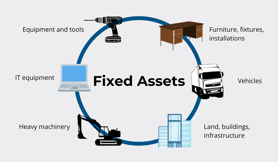 For construction companies, such long-lived assets typically include heavy machinery, vehicles, equipment, tools, and other items like IT equipment and office furniture, as well as real estate (land, buildings, infrastructure).