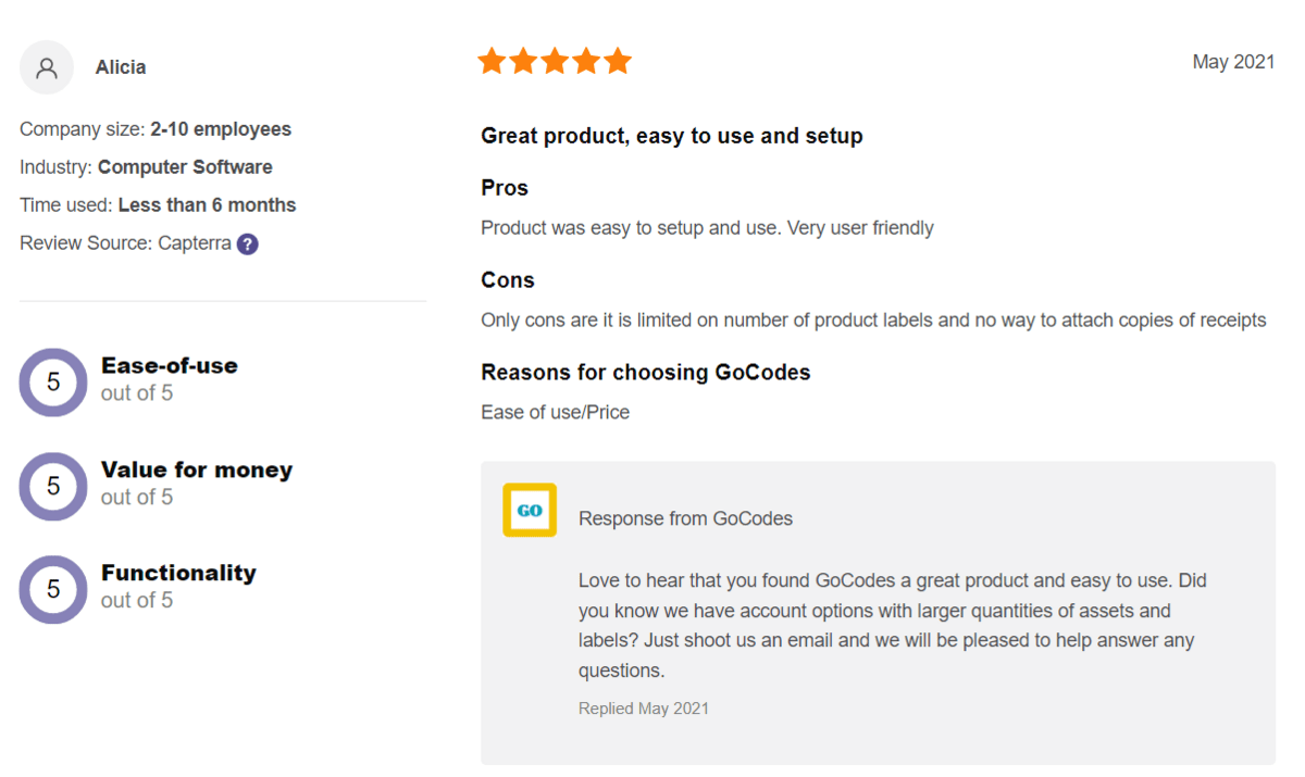 As one of GoCodes Asset Tracking’ customers reported, the software is very easy to set up and use, which gives you more time to spend on your core business activities.