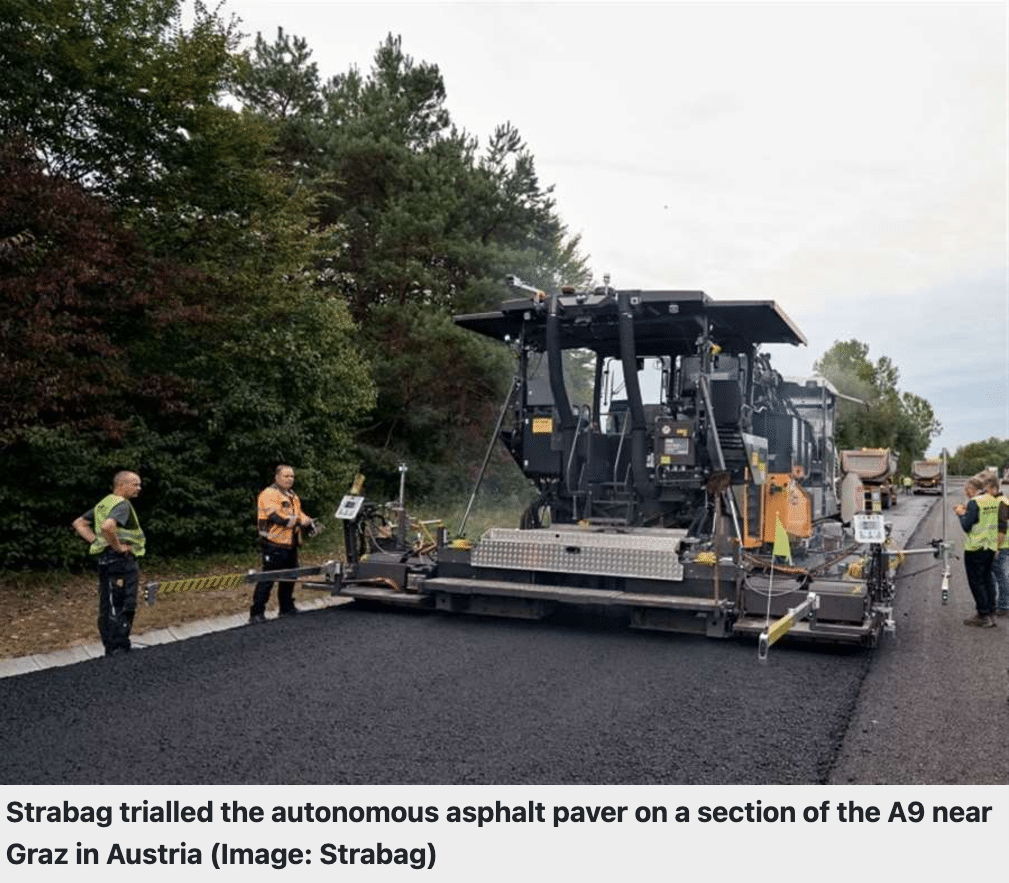 Take, for instance, the Austria-based construction group Strabag, which successfully tested a new autonomous asphalt paving technology recently.