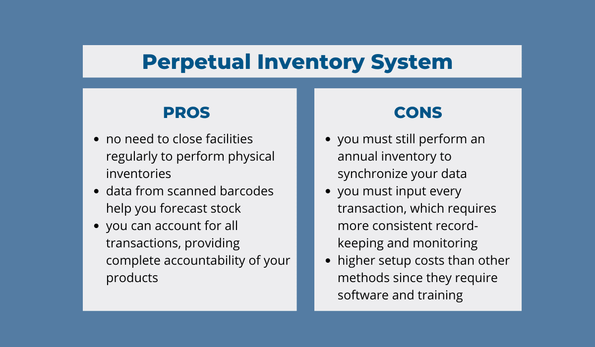 Despite certain downsides, the perpetual inventory control system is crucial for companies of all sizes with large volumes of inventory or multiple locations, such as construction companies, because it significantly reduces the costs of counting inventory.