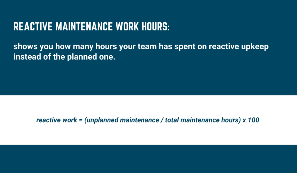 The reactive maintenance work hours KPI shows you how many hours your team has spent on reactive upkeep instead of the planned one.