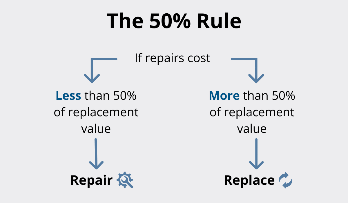 Adhering to the 50% rule, which stipulates replacement when repair costs exceed half the expense of a new machine, you opt to procure a new one.