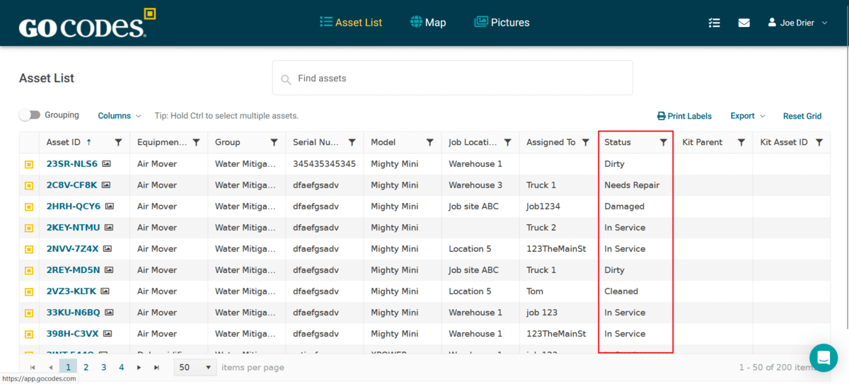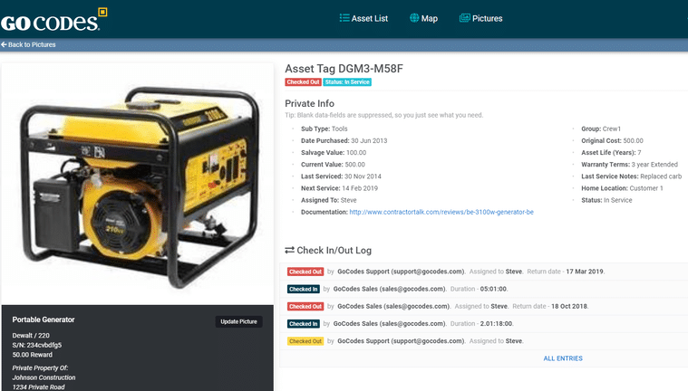 GoCodes Asset Tracking, a QR code-based system equipped with GPS location monitoring and a host of other useful features, provides a consolidated database containing all relevant machine information, including previous repairs, status, condition, user, and more.