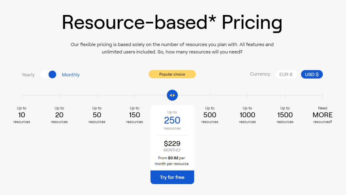 For managing up to 250 resources, Ganttic recommends their $229 per month plan.
