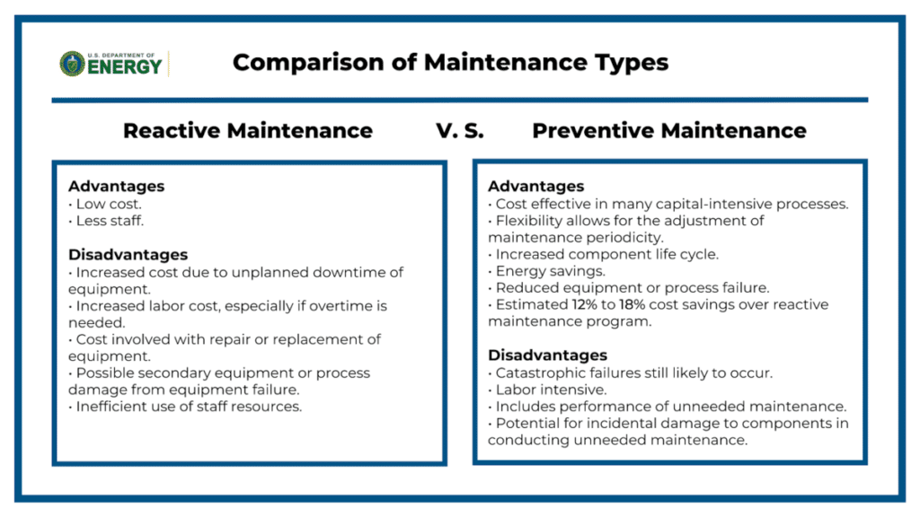 And the US Department of Energy agrees. In their Operations and Best Practices Guide, they compare different maintenance approaches and conclude that a preventive maintenance strategy comes with a cost reduction of 12% to 18% over reactive maintenance.