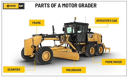 Here you can see the main parts of a motor grader, courtesy of NMC Cat: