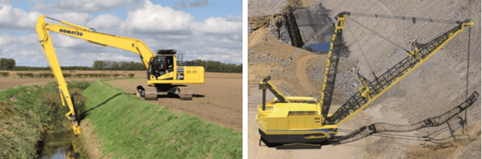 Turning back to track excavators, civil engineering projects often require deep or even underwater excavations, so there are specific models for such applications. In the images below, for instance, you can see long-reach (long-arm) excavators and dragline excavators.