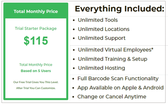ShareMyToolbox is subscription-based, and their trial starter package based on five users starts at $1,380 per year, which is paid monthly.