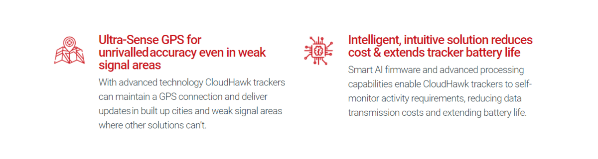 One notable characteristic of CloudHawk trackers is that they maintain precision even with very low GPS signal levels, thanks to their Ultra-Sense GPS.
