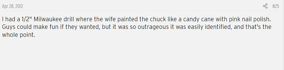 For example, this contractor’s wife turned a simple drill into a garish imitation of candy cane with some nail polish.
