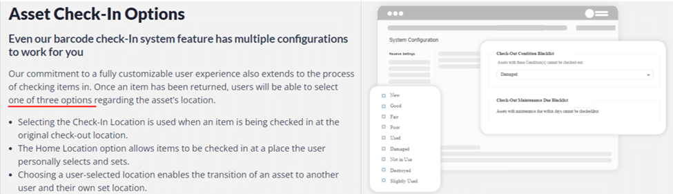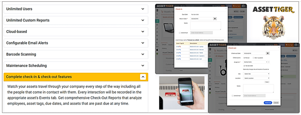 Here are AssetTiger’s main features, with check-in/check-out highlighted.