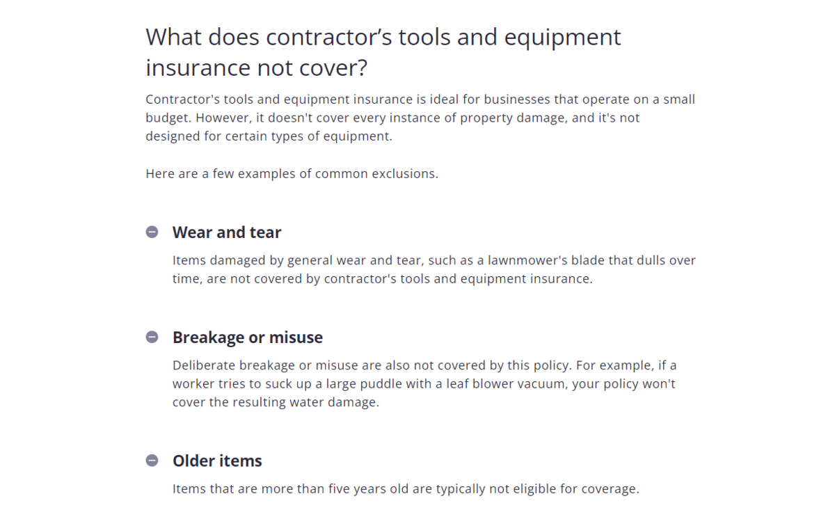For example, Insureon, a marketplace for online delivery of small business insurance, clearly lists what isn’t covered by their Contractor’s Tools and Equipment Insurance.
