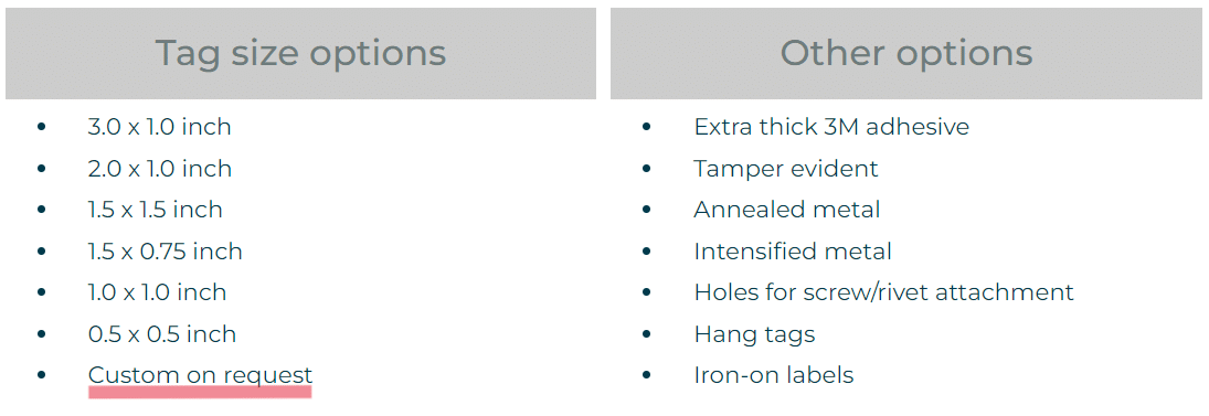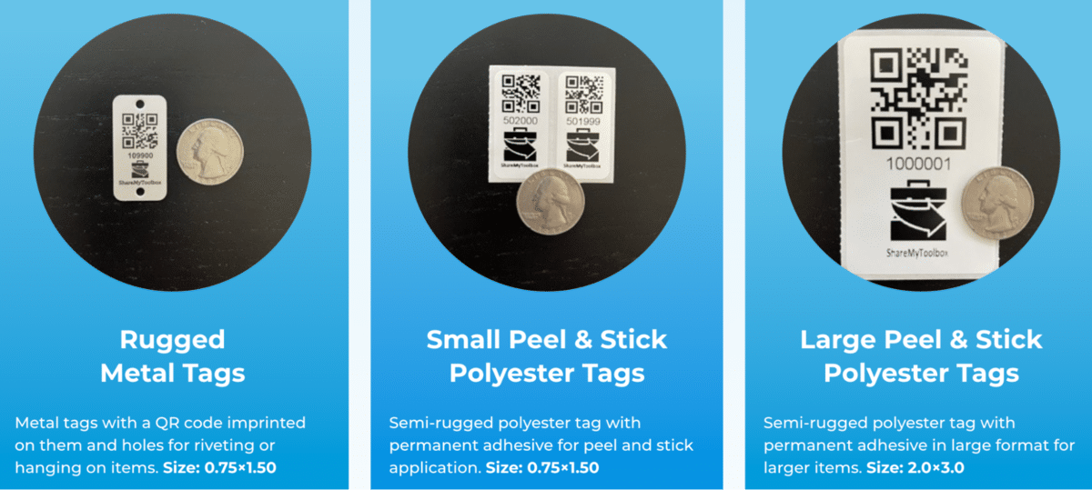 Like our tags, their asset tags are also small enough to be used on small tools and come in various materials – rugged metal tags or polyester stickers.