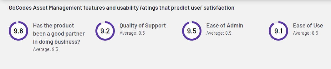 In addition to its powerful features, GoCodes Asset Tracking has earned consistently high grades relating to usability and support, as seen by this summary from software review platform G2.