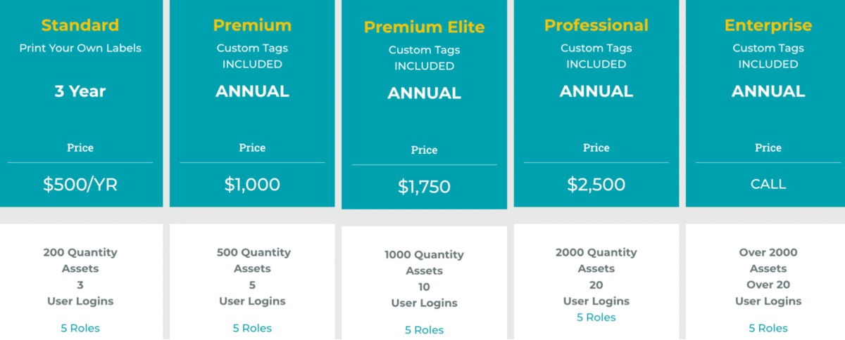 GoCodes Asset Tracking pricing is subscription-based and includes 5 distinct service plans, accommodating different asset quantities and number of user logins.