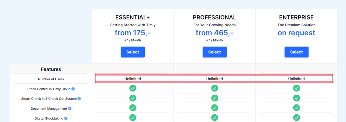 Timly offers a flexible pricing structure, with different add-on modules available depending on the plan. All three pricing plans boast an unlimited number of users.