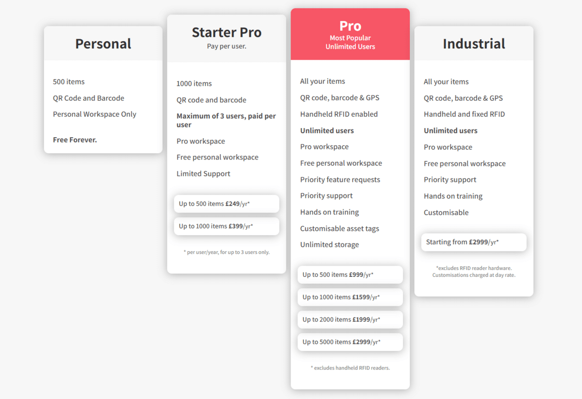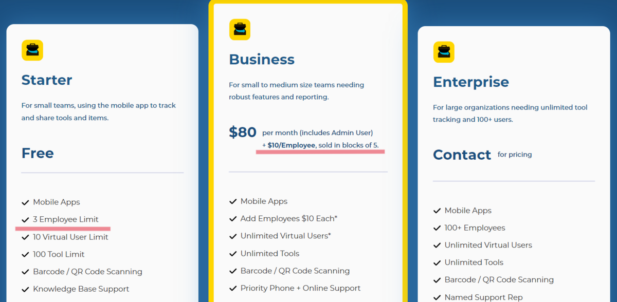 The number of tracked tools is unlimited for both, but adding each new user as a part of the “Professional” plan will cost you an extra $10 a month.