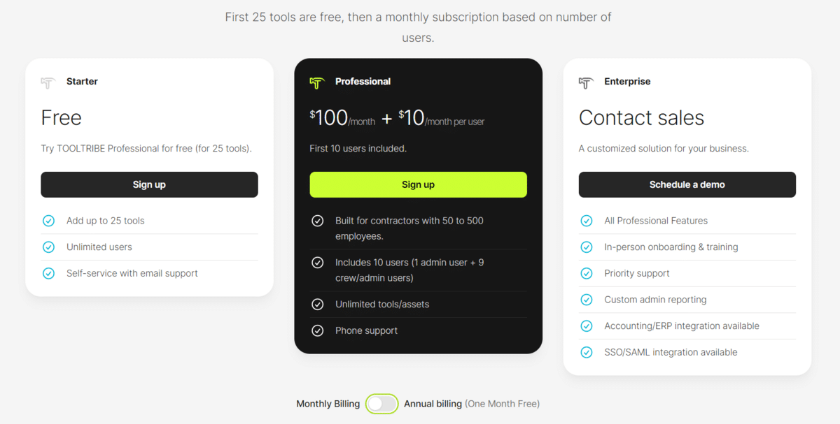 TOOLTRIBE offers two pricing plans based on the number of users, plus a free plan.