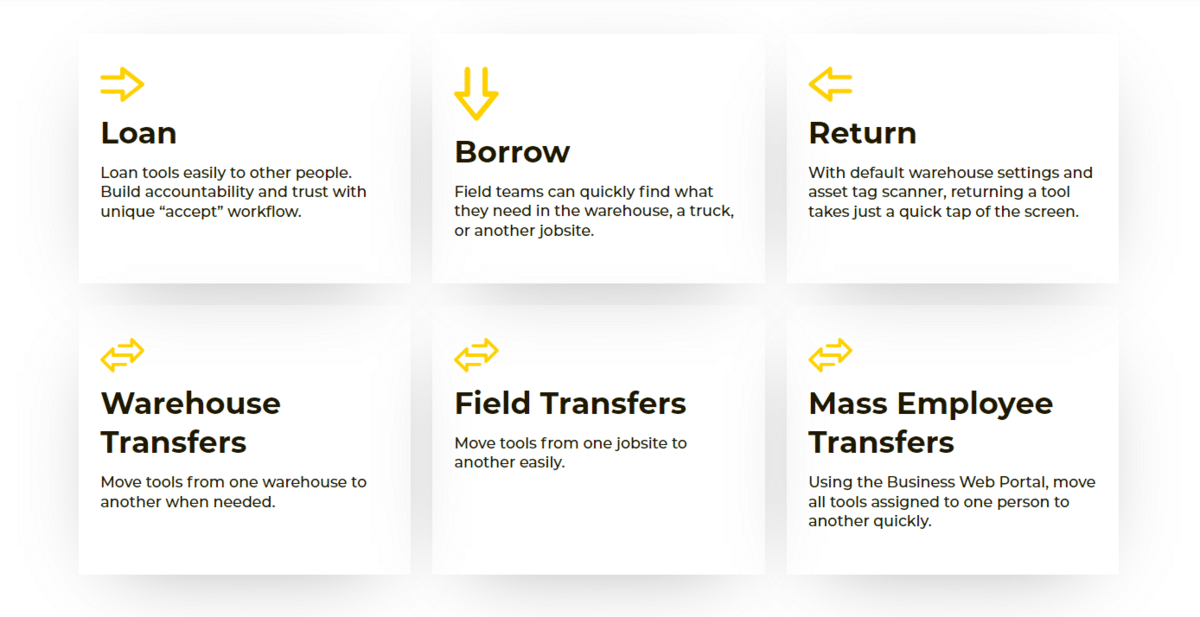 ShareMyToolbox prioritizes efficient workflows and can easily track single exchanges and bulk transfers as tools move between warehouses, job sites, and different employees.