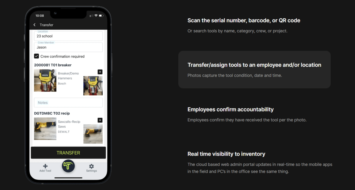 Asset transfers happen through three simple steps that don’t interrupt the workflow, yet answer key questions on the tool’s last known location and condition, and who is accountable for it.